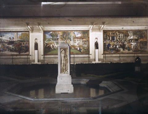 Complément historique: Selon l’article « Have you seen the New Murals » paru dans la revue américaine « Store & Home » à l’été 1927, les toiles de Henri Marret ont été reproduites à l’identique par l’atelier d’Henri Marret et ce à la demande des magasins Wanamaker à Philadelphie, puis transportées aux USA et « insérées dans les murs ».