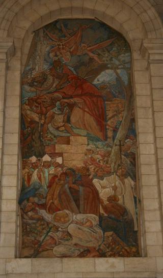 (*) Certains documents datent la réalisation de cette fresque en 1933 pour la réouverture de la Cathédrale après les travaux. |
